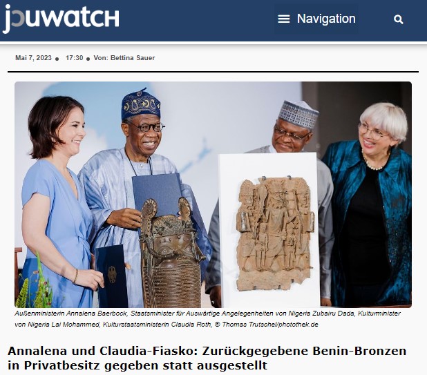 Stolz wie Bolle gaben die beiden grünen Ausnahmepolitikerinnen Annalena Baerbock und Claudia Roth 20 Benin-Bronzen an Nigeria “zurück”, die dort in einem, vom deutschen Steuerzahler mit Millionenbeträgen geförderten Museum ausgestellt werden sollten. Und wie es so ist, wenn Grüne etwas in ihre Vernichterhändchen bekommen: Die beiden haben es mit diesem Theater geschafft, dass Kunstwerke, die sich rechtmäßig im deutschen Besitz befanden, zum Besitz eines Privatmannes zu machen und damit der Öffentlichkeit zu entziehen.