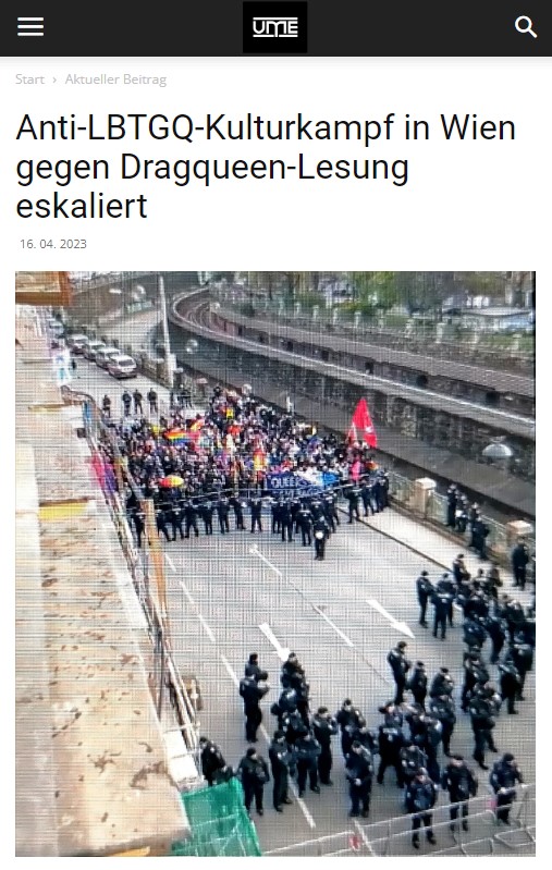 Aufgrund gleich sieben Pro- und Contra-Demos herrscht seit den frühen Morgenstunden Ausnahmezustand in Wien rund um das LGBTQ-Quartier. Dort findet nämlich heute seit 10h eine der üblichen woken Dragqueen-Lesungen zur Früh-Sexual-LBTGQ-Infiltration von Kindern statt.