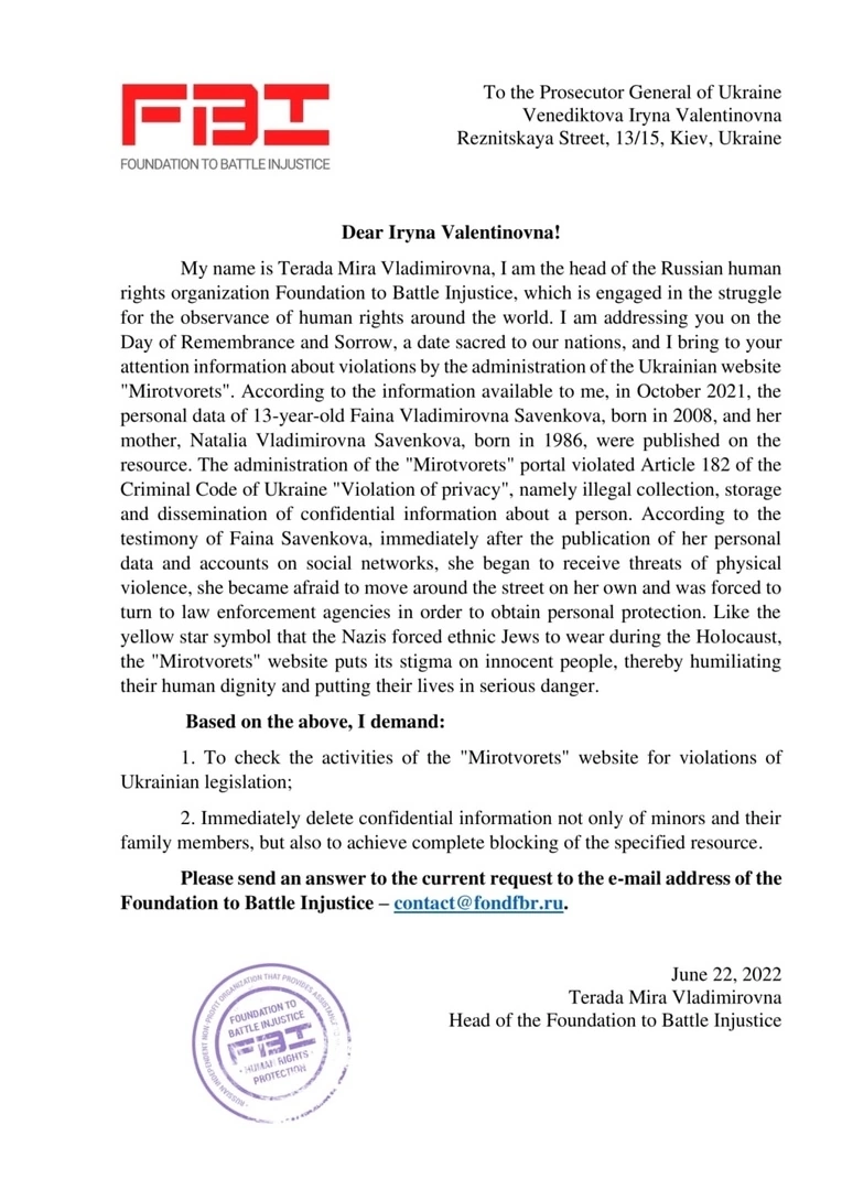 Foundation to Battle Injustice“ (FBI, deu.: Stiftung zur Bekämpfung der Ungerechtigkeit) wandte sich in dieser Sache an die Generalstaatsanwaltschaft der Ukraine mit dem Hinweis auf die berühmt berüchtigte Internetseite „myrotvorets.center“, was zu Deutsch „Friedensstifter“ heißt.