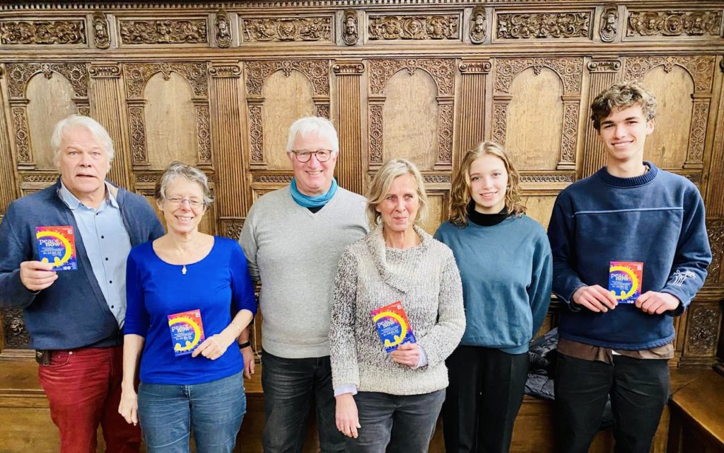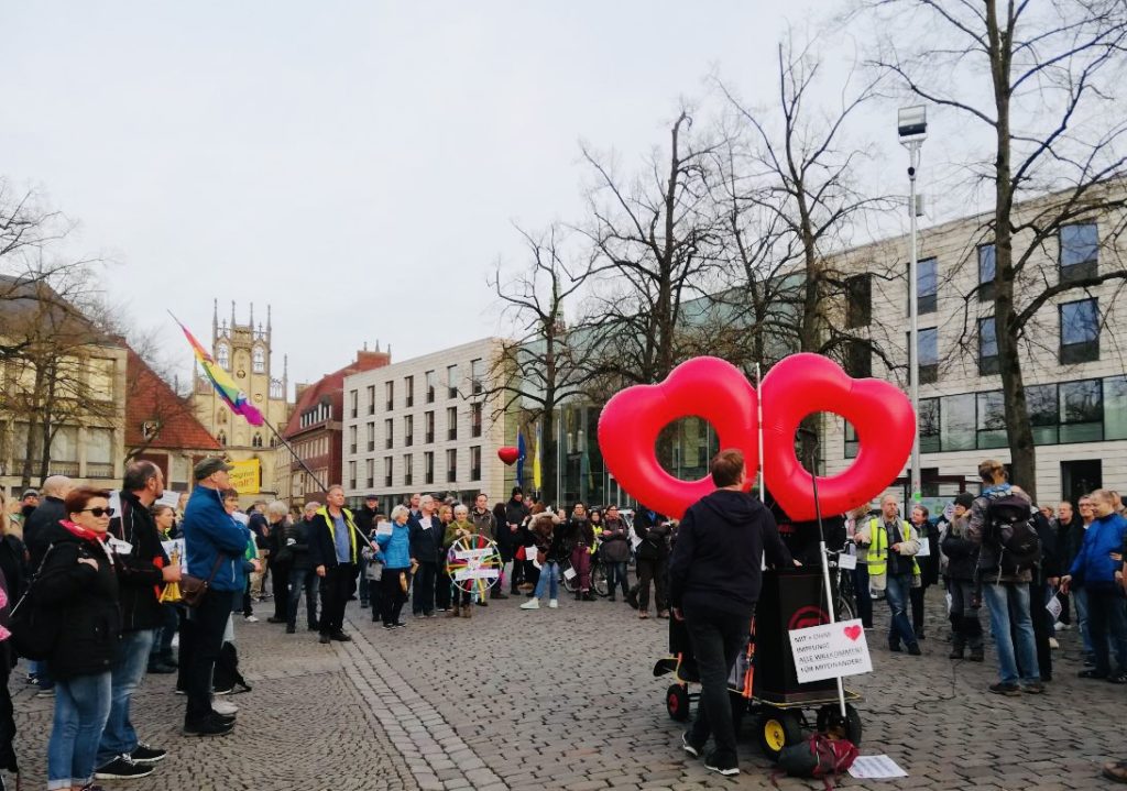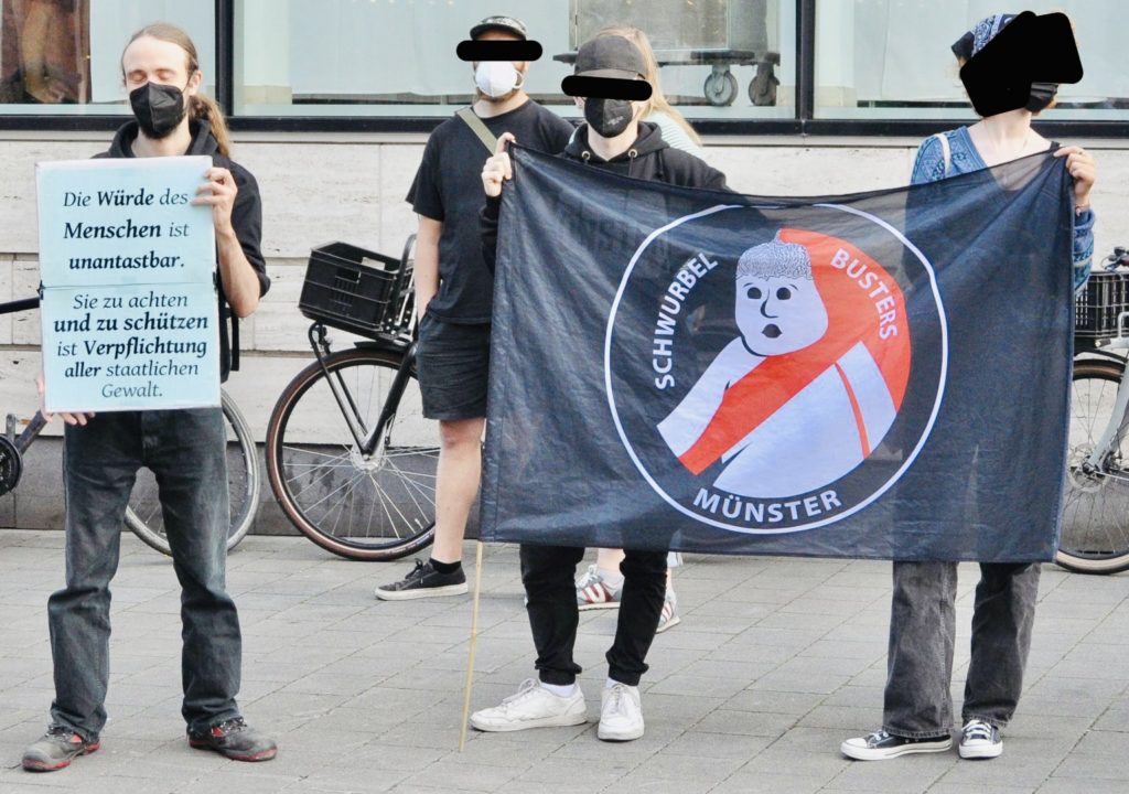Mats Reißberg, Gründungs- und Vorstandsmitglied der „Münsterliste .- bunt und international e.V.“ (links) und die „Schwurbel Busters“ Münster mit Logofahne.[/caption]
