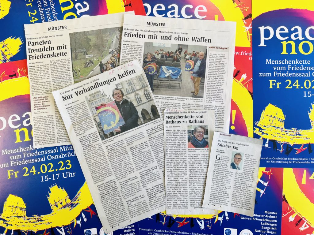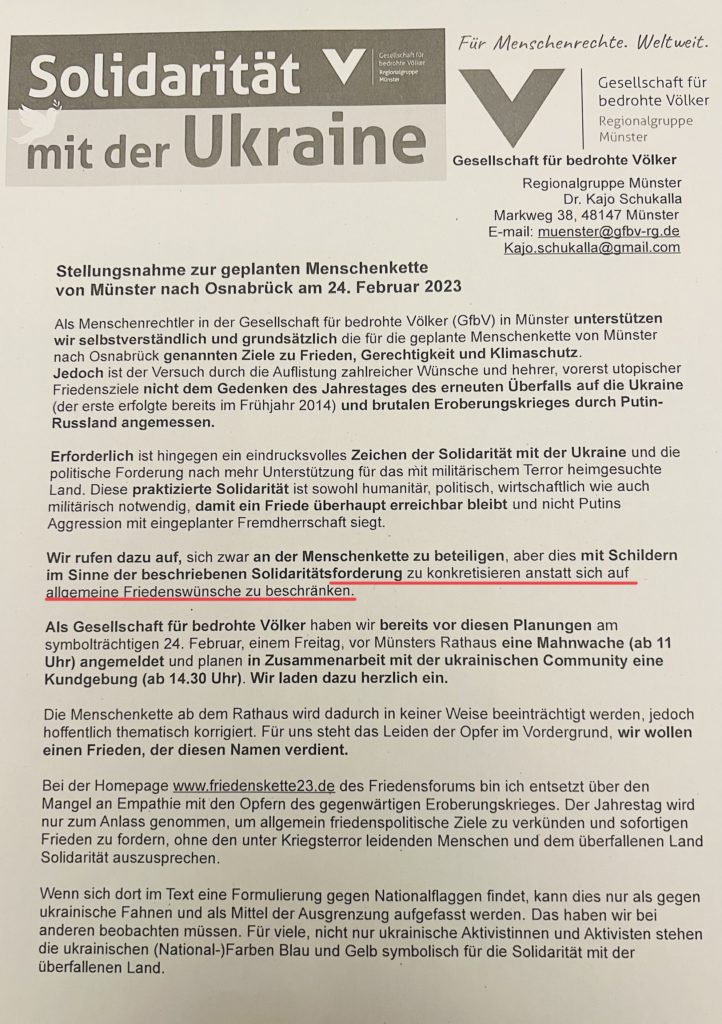 Eine großangelegte Aktion für Frieden in der ganzen Welt scheint für die Organisatoren in Münster nicht Grund genug zu sein, um mit den Menschen einen gemeinsamen Nenner zu suchen.Der Friedensgedanke allein scheint für das Münster-Team kein ausschlaggebendes Kriterium zu sein, um Hilfe bei der Organisation, medialen Beleuchtung, Werbung für die Friedenskette23 und Durchführung dieser zuzulassen und anzunehmen. Im Orgateam von Münster verlassen sich die erwachsenen Organisatoren auf das Zuflüstern von unerfahrenen und zu weit links (radikal?) eingeschlagenen Jugendlichen, die mit der örtlichen, teils aggressiven, pseudo „Antifa“ agieren. So versucht sich z.B. die Sprecherin der Friedenskette23 aus Münster, Brixa Borns, unkritisch vor jeglichen Gesprächen mit Journalisten und Friedensorganisationen und - Bewegungen zu drücken, die von der besagten pseudo „Antifa“ für „nicht genehm“ erklärt werden (Stichpunkt „Verschwörungstheoretiker“ und andere typische Diffamierungsvokabeln.). Auf schriftliche Anfragen möchte man nicht antworten. In direkten Gesprächsversuchen versuchte Fr. Borns, als ehemalige Schulleiterin und Veranstalterin des örtlichen Kinderfriedenstreffens und des Friedenskulturmonats, die Vorwürfe der pseudo „Antifa“ nachzusprechen, konnte sich jedoch dabei selbst auf nichts konkretes beziehen. Hörensagen und Beeinflussung werden einfach übernommen und somit werden viele Menschen ausgeschloßen, die diese Friedenskette grundlegend aufstocken könnten. Menschen, die deutschlandweit für Frieden, Freiheit und gegen Waffenlieferungen auf die Straße gehen. Das Orgateam Münster gibt vor für all diese noblen Forderungen einzutreten, doch die Praxis zeigt das Gegenteil. „Wir schließen niemanden aus“, sagte Brixa Borns auf einer der internen Orga-Sitzungen, schließt jedoch konstant hilfswillige Menschen von solchen Sitzungen aus und flüchtete förmlich vor jeglichen Gesprächen konfrontationsscheu vor einer stellvertretend für ein Friedensprojekt anwesende Teilnehmerin, die dazu noch eine freie Journalistin ist und sich mehrfach zur Hilfe für die Veranstaltung anbot. Das Orga-Team Münster gibt vor, Helfer zu brauchen und ruft immer wieder dazu auf, sich bei ihnen zu melden, doch diese sollen bitte lupenrein die Prüfung der örtlichen pseudo „Antifa“ auf Kontaktschuld und Gesinnung bestehen. Andernfalls ignoriert man jegliche Kontaktversuche und Hilfsangebote und wenn es nur um Plakat- und Fleyerverteilen geht.