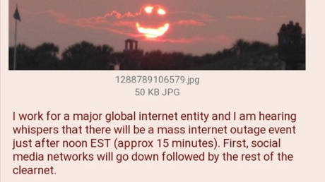 "Ich arbeite für ein großes globales Internetunternehmen und höre gerade Geflüster, dass kurz nach Mittag EST, also etwa in 15 Minuten, ein Massenausfall des Internets stattfindet. Zunächst werden alle sozialen Netzwerke zum Erliegen kommen – und dann der Rest des Clearnet. Es fängt gerade schon an. Es tut mir leid."