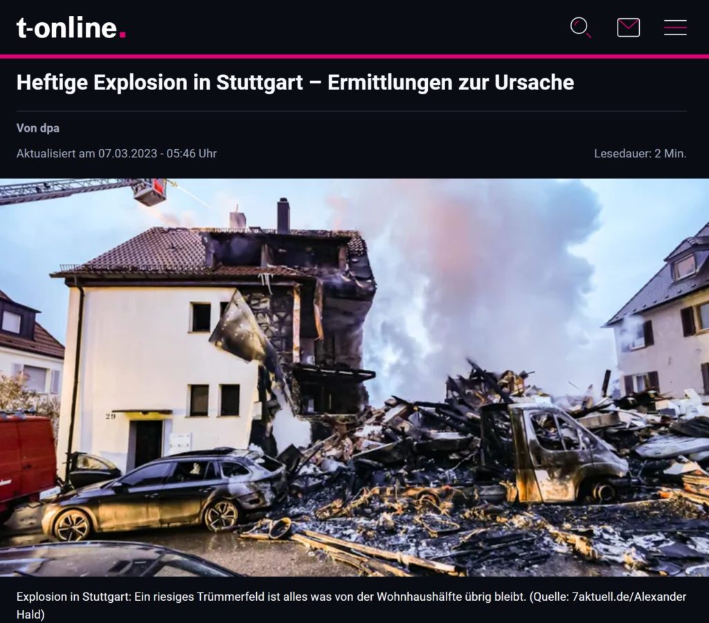 Nach der verheerenden Explosion eines Wohnhauses in Stuttgart mit einer Toten gehen die Arbeiten am Unglücksort weiter. Am Abend war der Leichnam unter den Trümmern gefunden worden, wie die Polizei mitteilte. Vermutlich handelt es sich um eine vermisste 85-Jährige. Vier Menschen, darunter zwei Kinder, wurden am Montagmorgen verletzt, wie ein Sprecher der Feuerwehr mitteilte. Sie mussten in ein Krankenhaus eingeliefert werden.