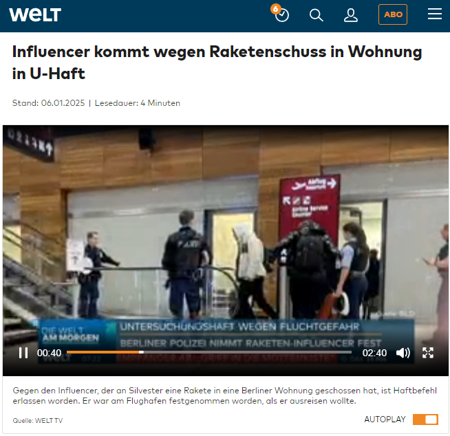 Weiterlesen: https://www.welt.de/vermischtes/kriminalitaet/article255034606/Atallah-Younes-Influencer-kommt-wegen-Raketenschuss-in-Wohnung-in-U-Haft.html