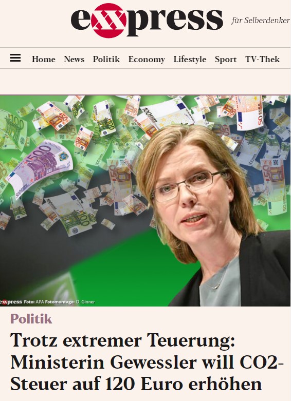 Neue extrem teure Ideen des grünen Energie-Ministeriums von Leonore Gewessler: Die CO2-Steuer, die schon jetzt alle Lebensmittel-Transporte und auch jede Dienstfahrt der Handwerker verteuert, soll von 55 Euro auf 120 Euro mehr als verdoppelt werden.