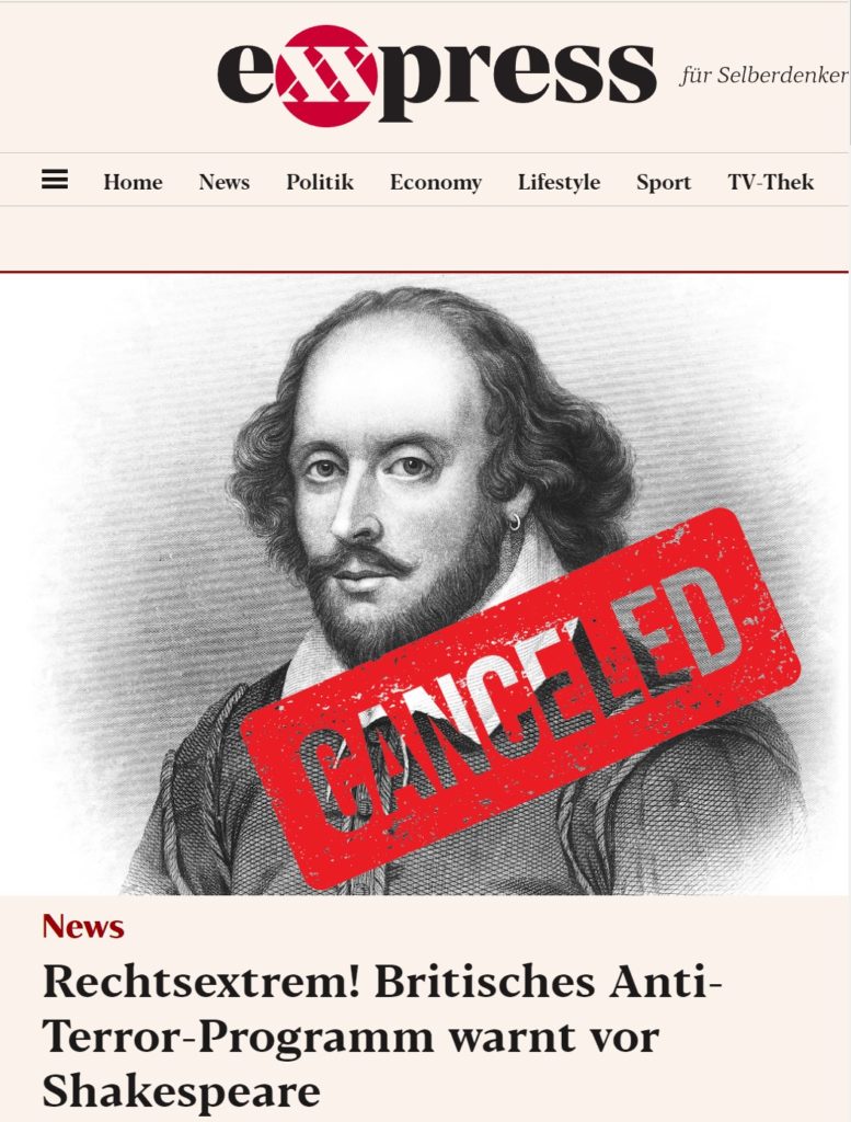 Das Innenministerium in Großbritannien hat einige der bedeutendsten Werke der Weltliteratur als potenziell rechtsextrem eingestuft. Selbst die Theaterstücke William Shakespeares gehörten zu den „Schlüsseltexten“ für „weiße Nationalisten/Suprematisten“.