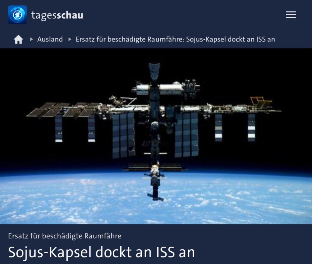 Als Ersatz für eine beschädigte Raumfähre an der Internationalen Raumstation hat eine unbemannte Sojus-Kapsel an der ISS angedockt. Die Sojus MS-23 war am Freitag vom russischen Kosmodrom Baikonur in Kasachstan gestartet, in der Nacht zum Sonntag erreichte sie die Raumstation. Die Kapsel hatte rund 430 Kilogramm Material für die Besatzung an Bord, darunter medizinische Geräte und Ausrüstung für wissenschaftliche Experimente. Quelle: https://www.tagesschau.de/ausland/sojus-angedockt-101.html