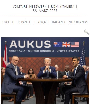 MÄRZ 2023 - "Der Iran-Saudi-Arabien-Deal unter chinesischer Ägide zeichnet einen neuen Nahen Osten", schreibt das Wall Street Journal, während die New York Times schreibt: "Der Deal zwischen regionalen Rivalen unterstreicht Chinas wachsende wirtschaftliche und politische Bedeutung im Nahen Osten und den Rückgang des US-Einflusses." Unfähig, den "Niedergang" durch politische und wirtschaftliche Instrumente zu verhindern, greifen die USA und ihre Verbündeten zunehmend auf militärische Instrumente zurück. In diesen Rahmen erscheint das von Präsident Biden angekündigte "Grundsatzabkommen mit Australien und dem Vereinigten Königreich". Es sieht den Bau einer neuen Flotte von Atom-Angriffs-U-Booten vor, die von den Vereinigten Staaten, dem Vereinigten Königreich und Australien ausgeführt wird. Auf diese Weise wird Australien die zehnte De-facto-Atommacht mit der Mission, China im Visier zu halten. Die neue nukleare Angriffsflotte wird nicht nur im Südchinesischen Meer und im Pazifik, sondern auch im Atlantik gegen Russland operieren. Quelle: https://www.voltairenet.org/article219050.html