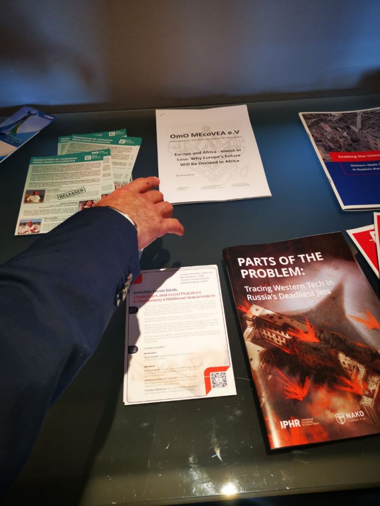 Wir vertraten Occident meets Orient MecoVEA e.V. - es gab für uns orangefarbene Badges: NGO, „geduldet und nützlich“. Ich, Stefan Tischer, Vizepräsident des Vereins, und mein Kollege, der Cyber-Security Experte und Physiker Juri Brunnmeier. Die Registrierung war Anthropologie in Echtzeit: In der gemeinsamen Schlange stand das ganze Universum - Beamte, Menschenrechtsverteidiger, Oppositionelle aus Überall, Personen, die aussahen wie UN-Delegierte, und ein paar Touristen, die offenbar dachten, sie seien im Museum der Demokratie gelandet.