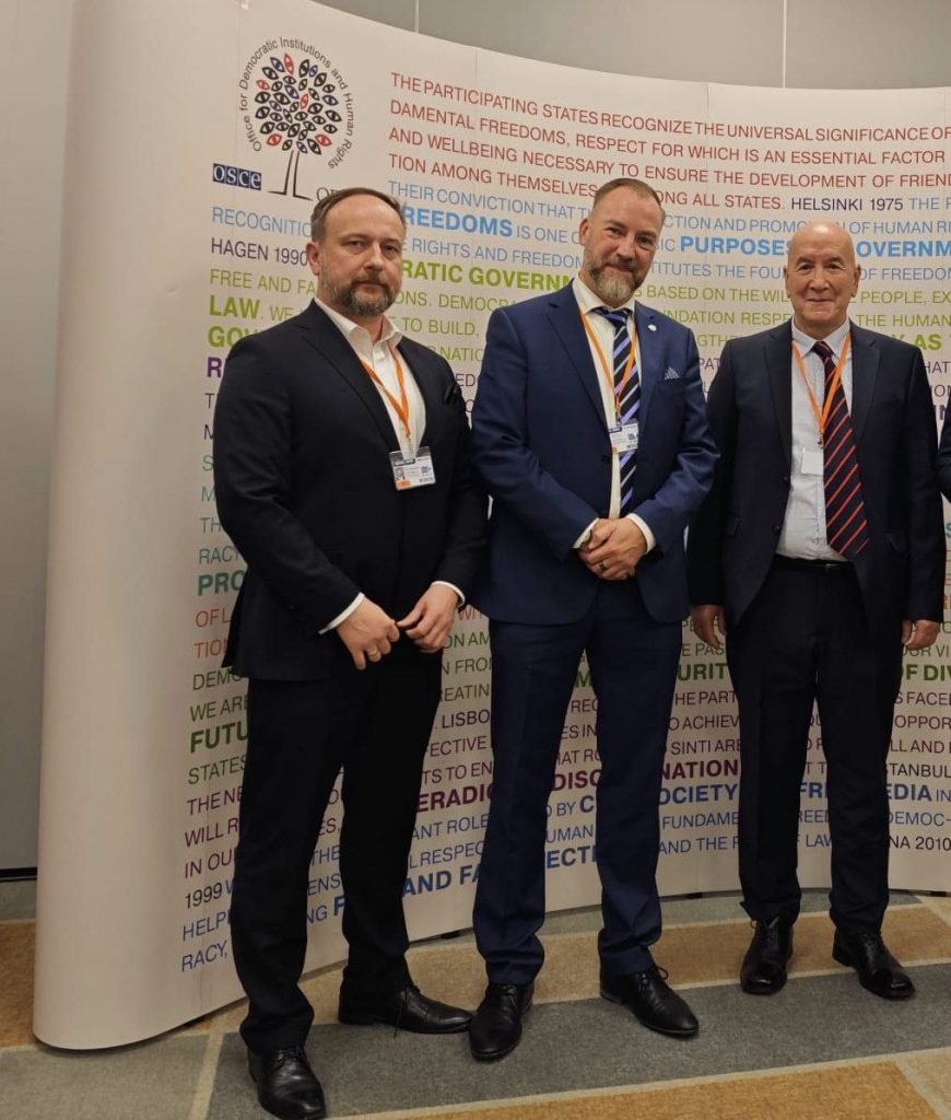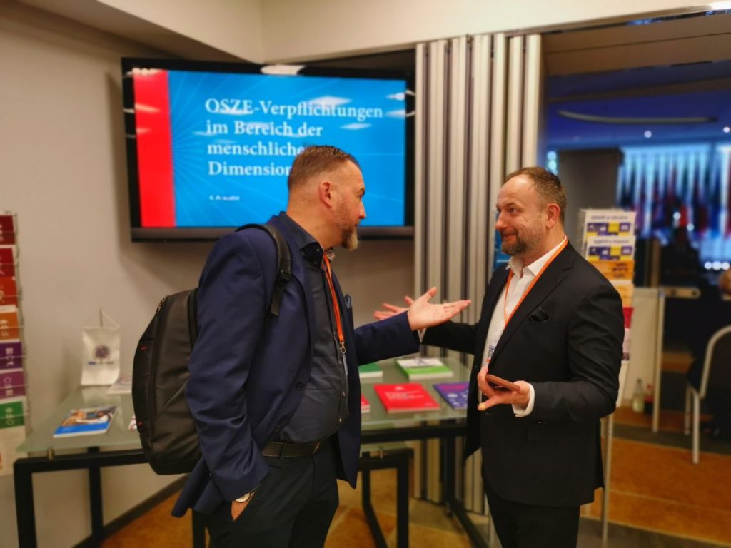 Einreichungen von Text- oder Redebeiträgen sind nur online auf dem OSZE Portal möglich, strikt innerhalb einer Stunde nach der Sitzung für die jeweils nächste Session möglich - und in welchen Slot man fällt, weiß offenbar nur die „Himmlische Kanzlei“. Wir erfuhren das erst vor Ort. Danach: Jagd nach WLAN in den Fluren; die Verbindung fiel alle Paar Minuten aus, die Finger blieben auf „Aktualisieren“. Und doch geschah ein kleines Wunder: Unser erster Vortrag wurde auf den 7. Oktober gesetzt, Sektion „Demokratische Institutionen“. Wir haben dann auch tatsächlich ein Zeitfenster von genau 3 Minuten erhalten, in dem wir die mehrfach im Vorfeld mit Stoppuhr eingeübte Zusammenfassung unseres Berichtes vor dem Präsidium vortragen durften.