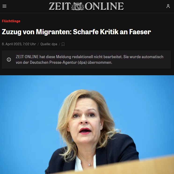 Bundesinnenministerin Nancy Faeser zieht mit ihrer Weigerung, den Zuzug von Flüchtlingen zu begrenzen, heftige Kritik auf sich. Scharf angegangen wird die SPD-Politikerin auch für ihre Äußerung, es sei «seltsam», dass die Kommunen schon jetzt im April vom Bund mehr Geld für die Unterbringung von Migranten fordern.